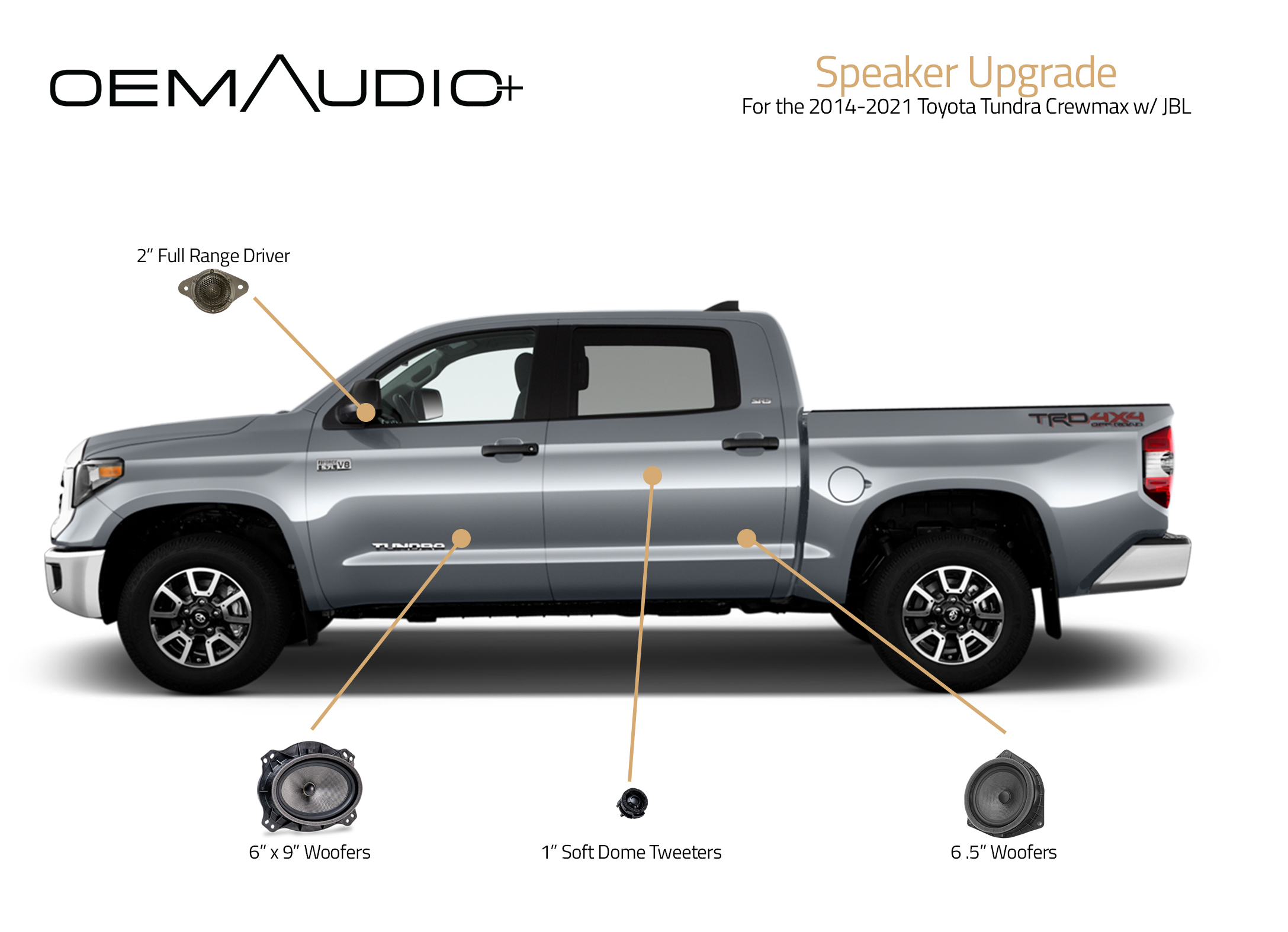 Speaker Upgrades specific for the 2014-2021 Toyota Tundra Crewmax w/ JBL. Superior dynamics, blending and low-frequency response. Completely plug and play, our drivers integrate seamlessly into your Tacoma w/o any modification (same factory mounting and connectors).