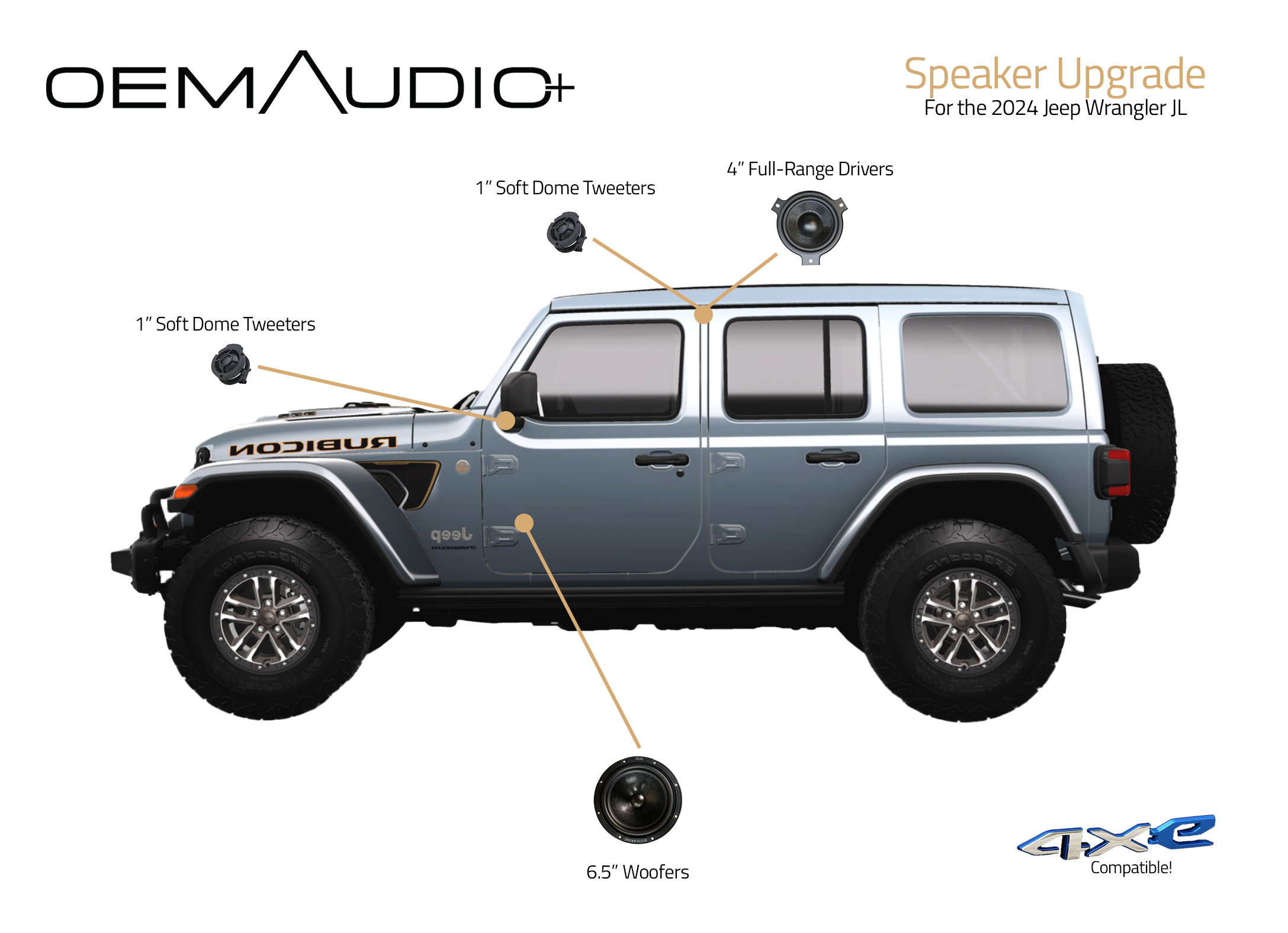 The Speaker Upgrade for the 2024 Jeep Wrangler JL includes complete speaker replacements offering superior dynamics, blending, and low-frequency response.